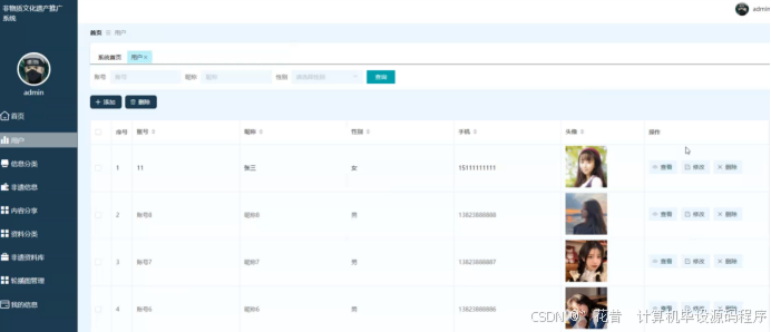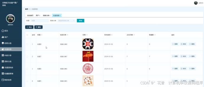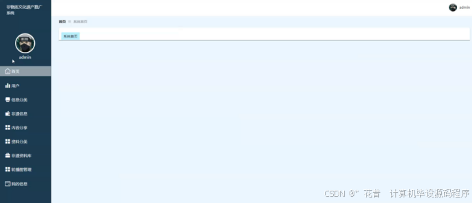 管理员后台管理:管理员登录后,可以对用户信息、非遗信息、内容分享、资料分类、非遗资料库、轮播图等进行管理。