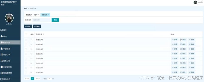 管理员进入主页面,主要功能包括对用户、信息分类、非遗信息、内容分享、资料分类、非遗资料库、轮播图管理、我的信息等进行操作。管理员主页面如图5-7所示: