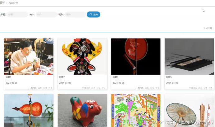 内容分享:用户可以在内容分享页面输入标题、简介或昵称进行查询,查看并操作内容分享的详细信息。