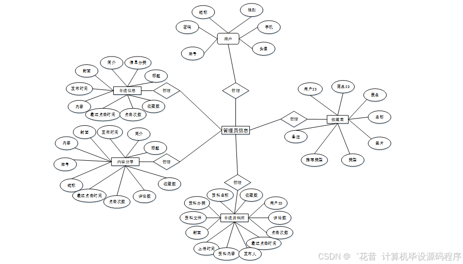 然后根据功能需求来对本系统的e-r图实现分解来得到几种实体—关系模型,以下将对“用户、收藏表、非遗资料库、非遗信息、内容分享”等作为实体,它们的局部E-R如图4-2所示: