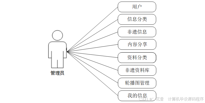 管理员模块:管理员是系统中的核心用户,管理员登录后,可以对后台系统进行管理。主要功能有用户、信息分类、非遗信息、内容分享、资料分类、非遗资料库、轮播图管理、我的信息等功能。管理员用例如图3-1所示。