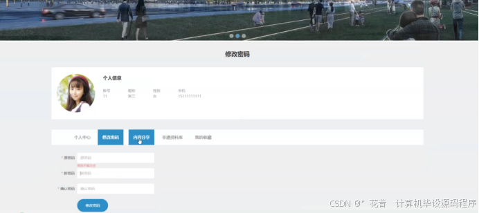 在个人中心页面可以对个人中心、修改密码、内容分享、非遗资料库、我的收藏等进行详细操作;如图5-5所示: