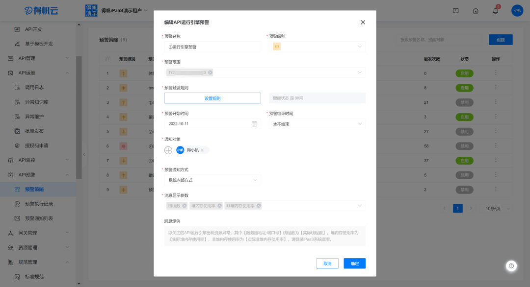 首先在「API预警-预警策略」创建「API运行引擎预警」策略,选择需要监控的服务器,并维护预警触发规则和通知对象、通知方式等信息。