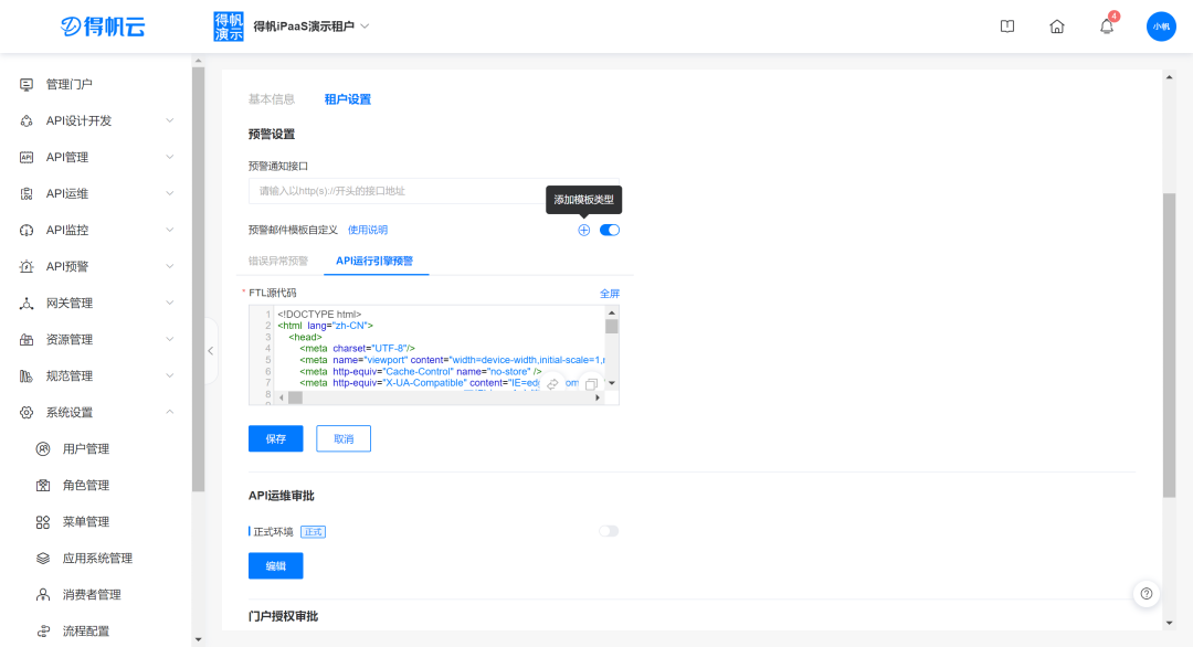 其次,在「租户信息-预警设置」中开启"预警邮件模版自定义"开关,添加“API运行引擎预警”的邮件模板,点击进入全屏对源代码进行修改。