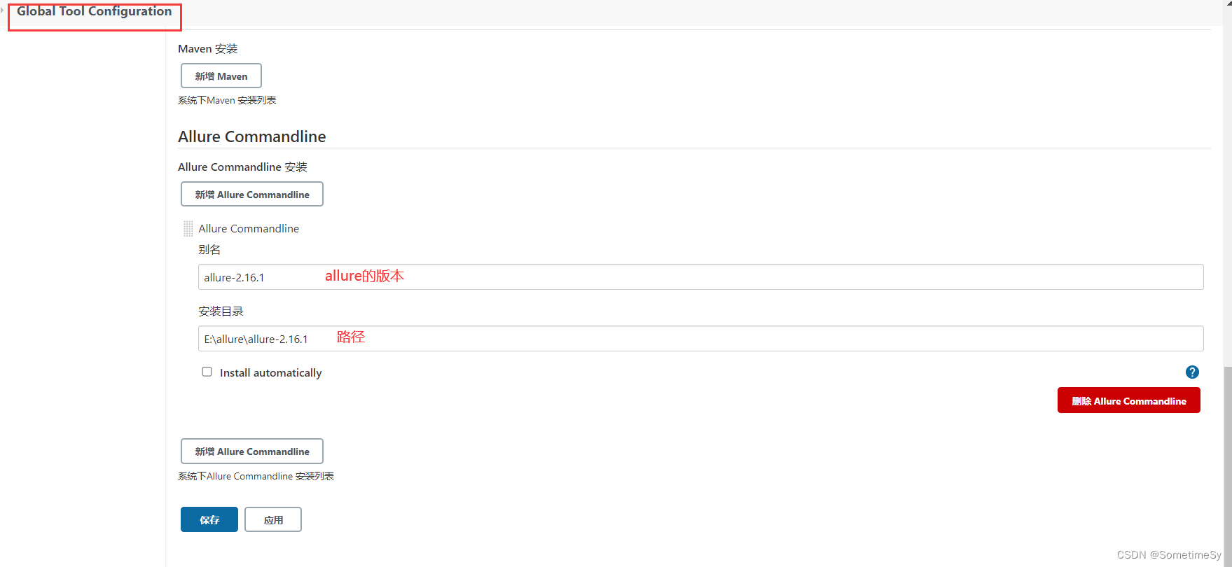 其次,在 全局工具管理中,新增设置,注意别名最好填本地allure的文件名