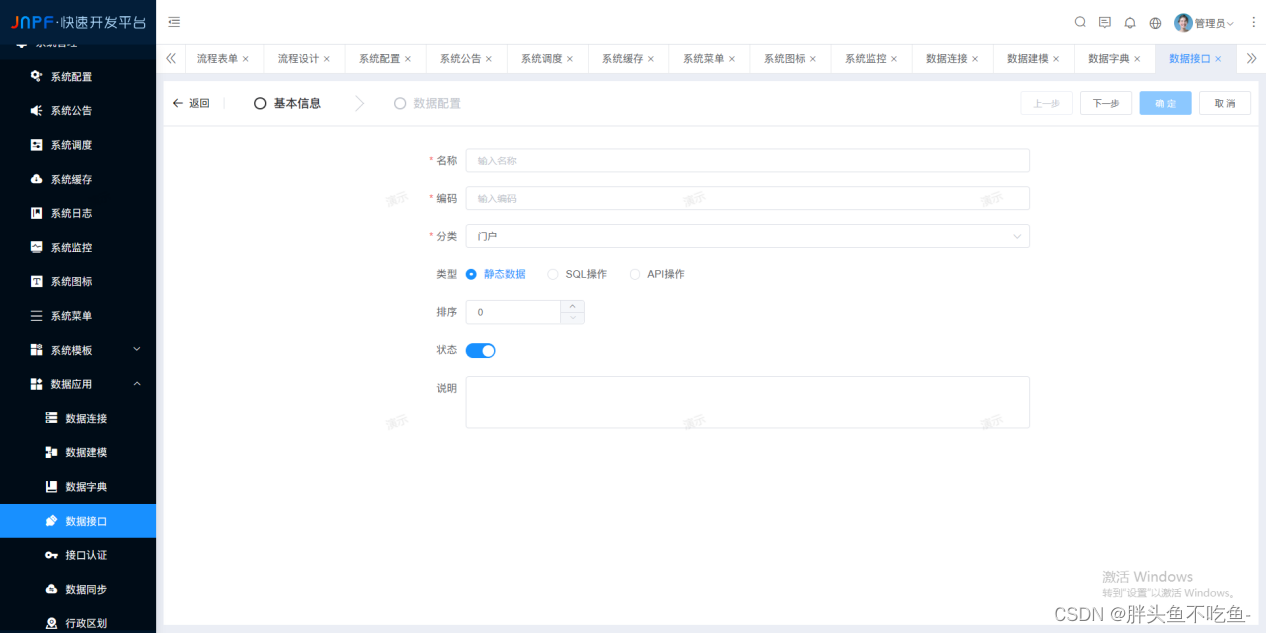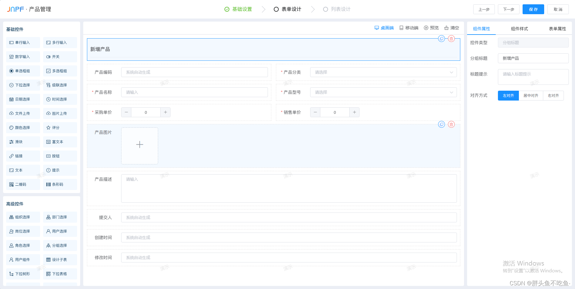 引擎式软件快速开发模式配置了图表引擎、接口引擎、门户引擎、组织用户引擎等可视化功能引擎,基本实现页面UI的可视化搭建。内置有百种功能控件及使用模板,使得在拖拉拽的简单操作下,也能大限度满足用户个性化需求。由于JNPF平台的功能比较完善,本文选择这项工具进行展开,使你更加直观看到低代码的优势。