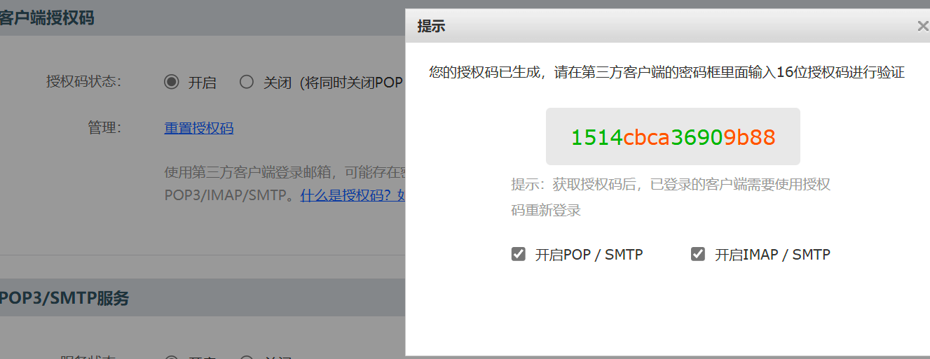 开启后会弹出授权码,授权码一定要保管好,因为只显示一次