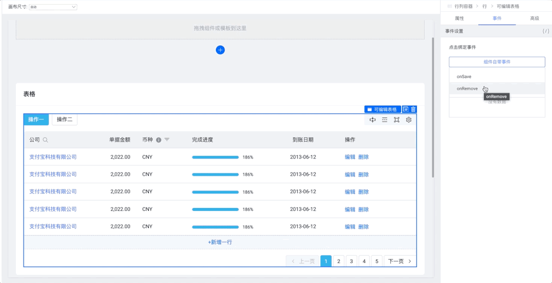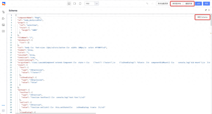 搭配顶部操作区的“保存到本地”和“重置页面”功能,可以实验各种 schema 对低代码页面的改变。