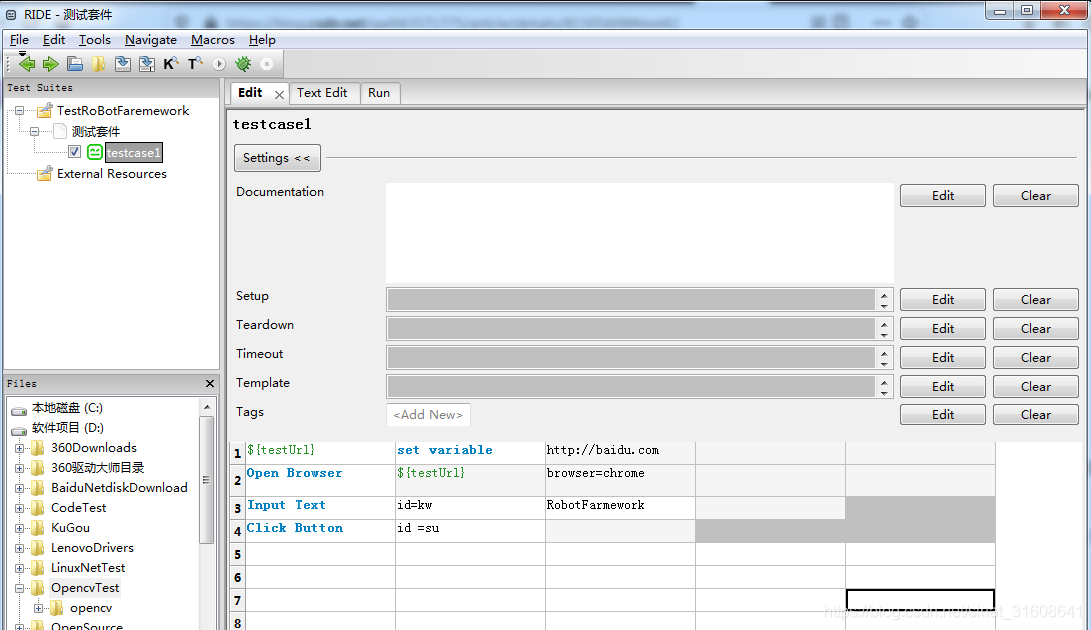 RIDE 编辑器启动界面,编写测试,Robot Framework用法总结,如下