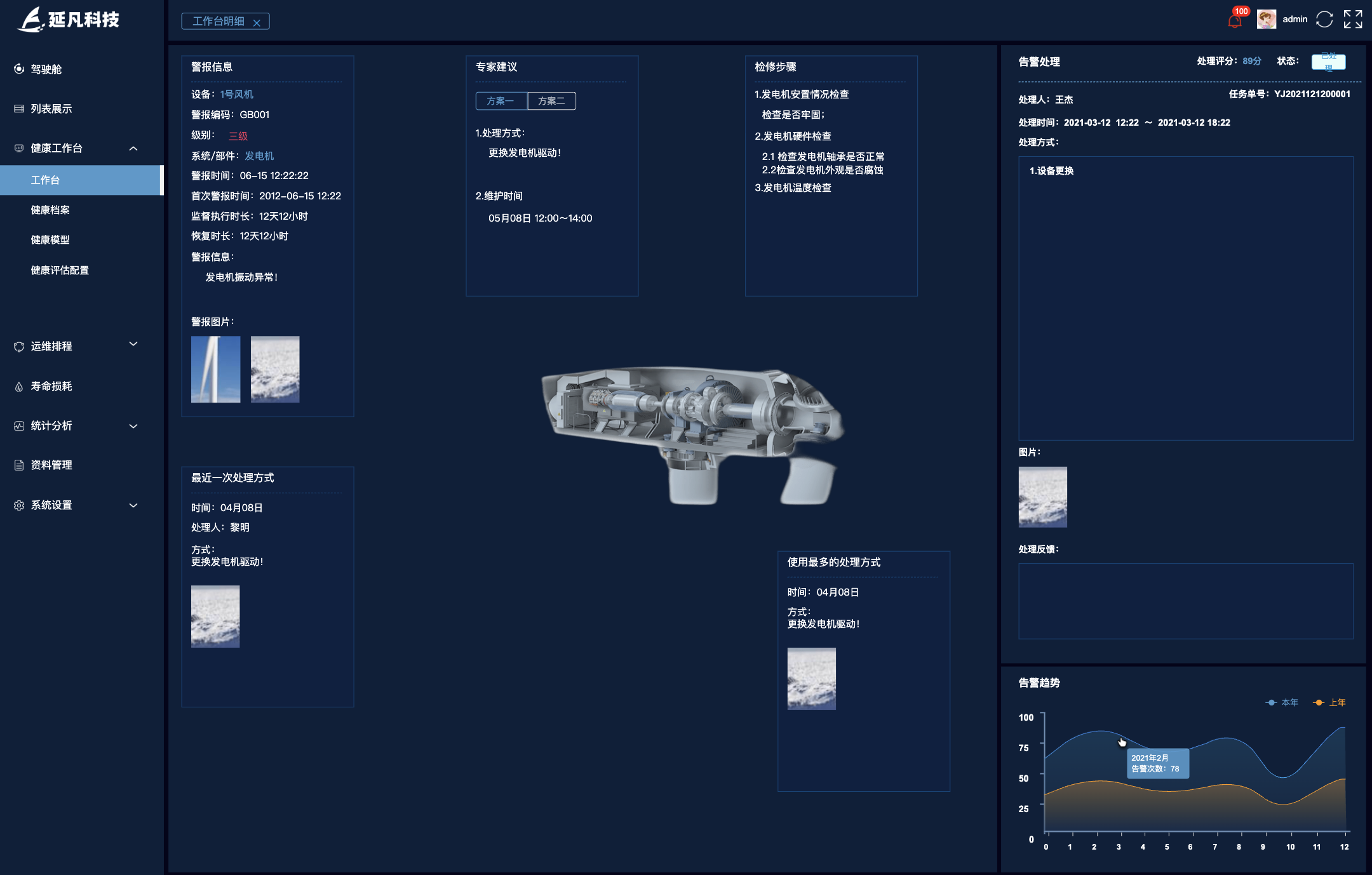- 建立运维知识库,包含:历史故障案例库(如 “2024 年 7 月 #3 风机变流器过温故障:原因是散热风扇灰尘堵塞”);维修工艺标准(如叶片修补的树脂配比、固化时间要求);专家经验模型(如 “冬季低温导致齿轮油粘度升高时,需提前启动加热系统”)。