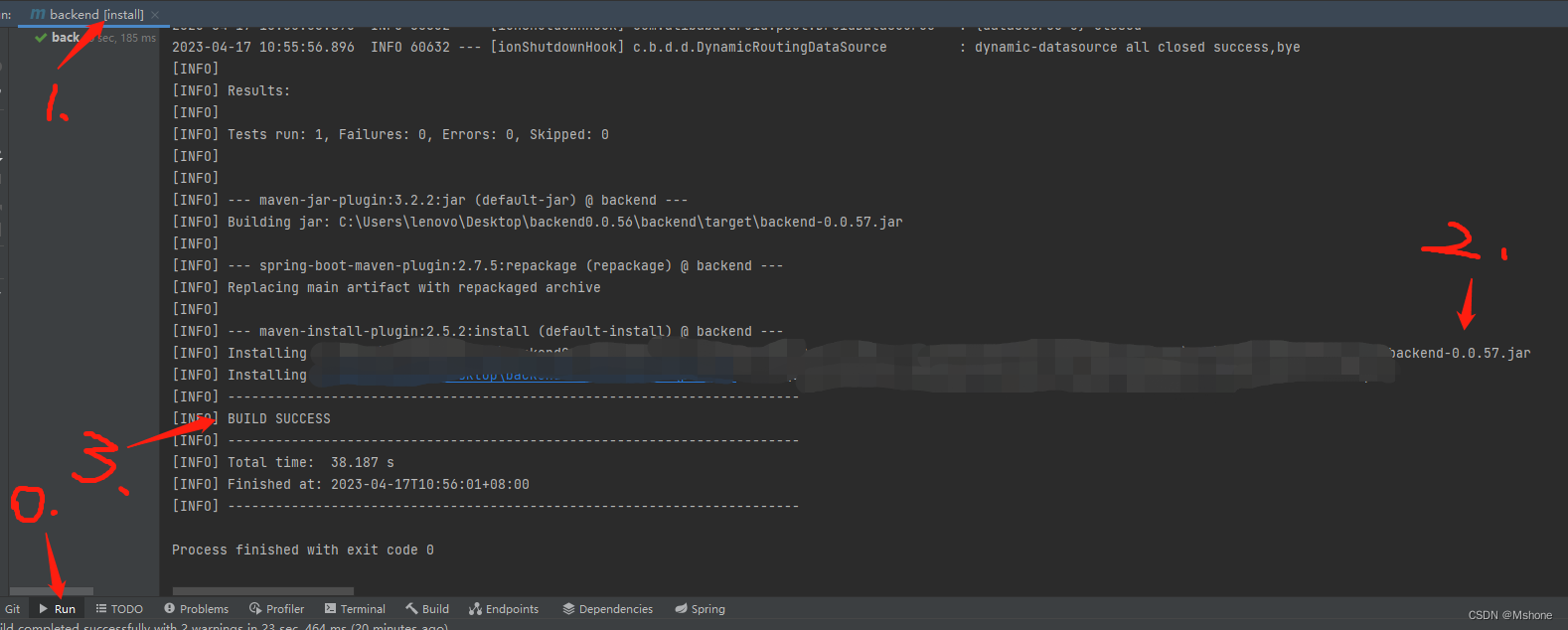 5. 查看打包成功标志:生成pom文件中定义的新版本号的目标jar包“backend-0.0.57.jar”和“BUILD SUCCESS”编译成功标志