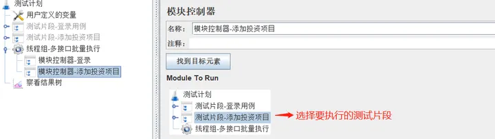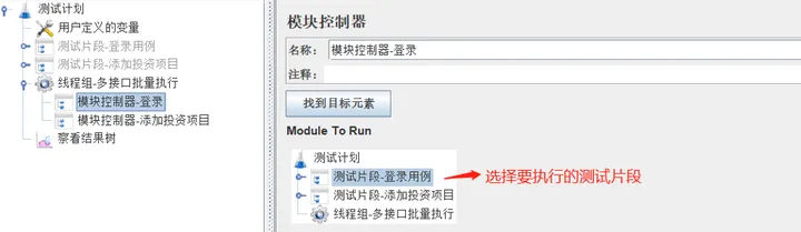 2)新建线程组,在线程组下添加模块控制器,选择需要执行的测试片段;