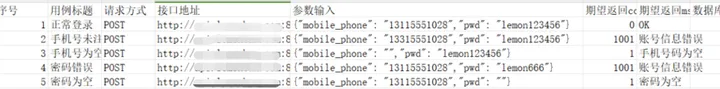 1) 以登录接口为例,先把需测试的各种正常/异常测试数据,整理到CSV文件中,如下: