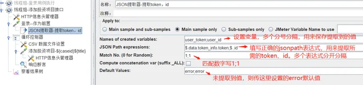 1)脚本结构如下,新建登录请求作为前置,在登录请求下添加json提取器,页面设置如下: