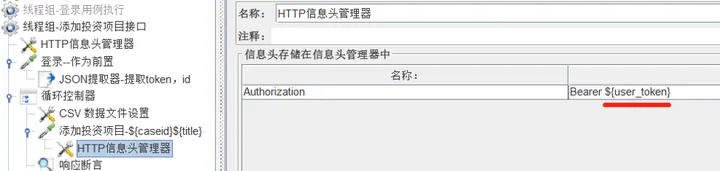 2)将提取到的token值,传递到下个接口的请求头使用,在添加投资项目接口下方添加HTTP信息头管理器,引用user_token变量的值