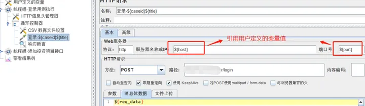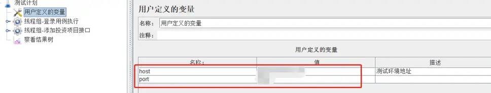 1)新建配置元件-用户定义的变量,设置host、port2个变量,用来保存当前测试环境地址信息