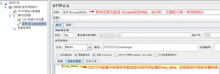 4)在循环控制器下,添加HTTP请求,修改名称,登录请求设置如下: