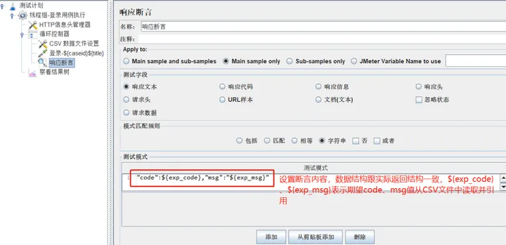 1)右键循环控制器-断言-添加响应断言,并设置断言内容如下