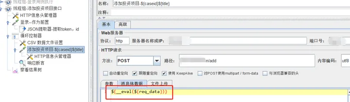 然后在添加投资项目接口的http请求页面,引用从CSV文件中读取的req_data变量值时,因为该值中嵌套了${user_id}变量值,因此这里要用Jmeter自带的__eval函数处理下。