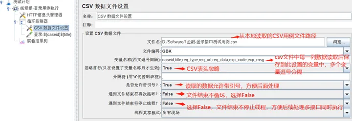 3)在循环控制器下,添加配置元件-CSV数据文件配置,用于读取CSV文件中的每条测试用例数据,配置如下: