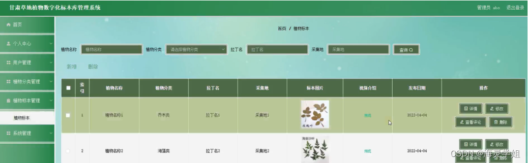 本系统开发选择Java技术,ssm框架,大大减少了使用windows编程的难度,减少开发人员在设计算法上的难度,作为java开发 Visual Studio更是一个必不可少的角色,它友好的界面,以及强大的功能,给程序开发人员带来了很多方便,加上环境简单,转移方便,无疑使此系统最佳的选择。植物标本管理,在植物标本管理页面可以对索引,植物名称,植物分类,拉丁名,采集地,标本图片,视频介绍,发布日期等内