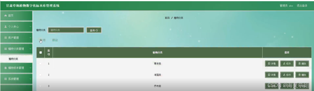 植物分类管理,在植物分类管理页面可以对索引,植物分类等内容进行详情,修改和删除等操作,如图5-8所示。
