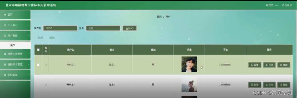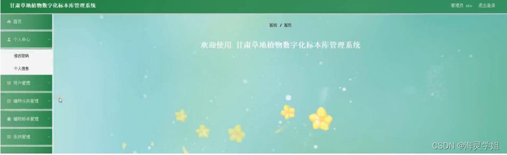 管理员登录系统后,可以对首页,个人中心,用户管理,植物分类管理,植物标本管理,系统管理等功能进行相应的操作管理,如图5-6所示。