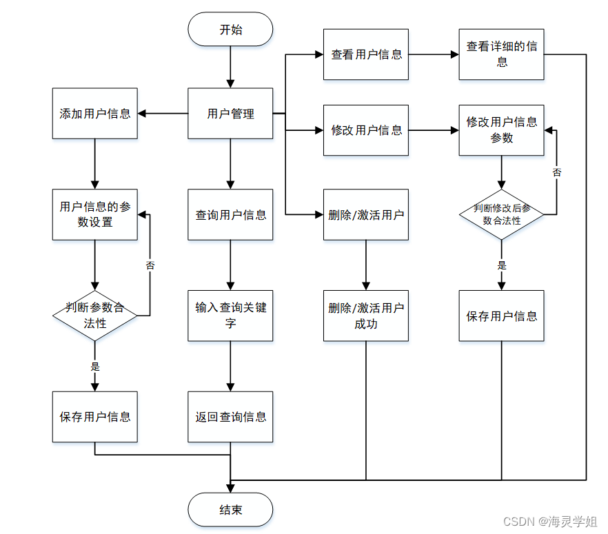 由于不同的系统实际使用用户角色的不同,他们的业务分析也会变得有所不一样,为了论述方便接下来都将以管理员和用户功能权限下的系统业务流程来分析,如下图所展示: