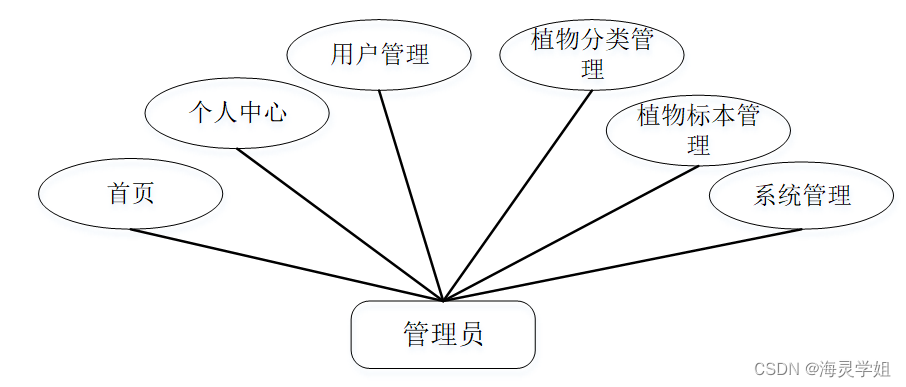 (a) 管理员;管理员使用本系统涉到的功能主要有:首页,个人中心,用户管理,植物分类管理,植物标本管理,系统管理等功能。管理员用例图如图3-1所示。