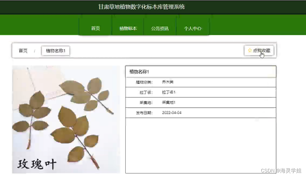 植物标本,在植物标本页面可以查看植物名称,植物分类,拉丁名,采集地,发布日期等内容,并进行操作,如图5-3所示。