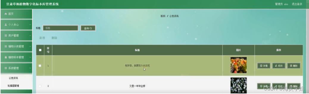 系统管理,在公告资讯页面可以对索引,标题,图片等内容进行详情,修改和删除操作;如图5-10所示。