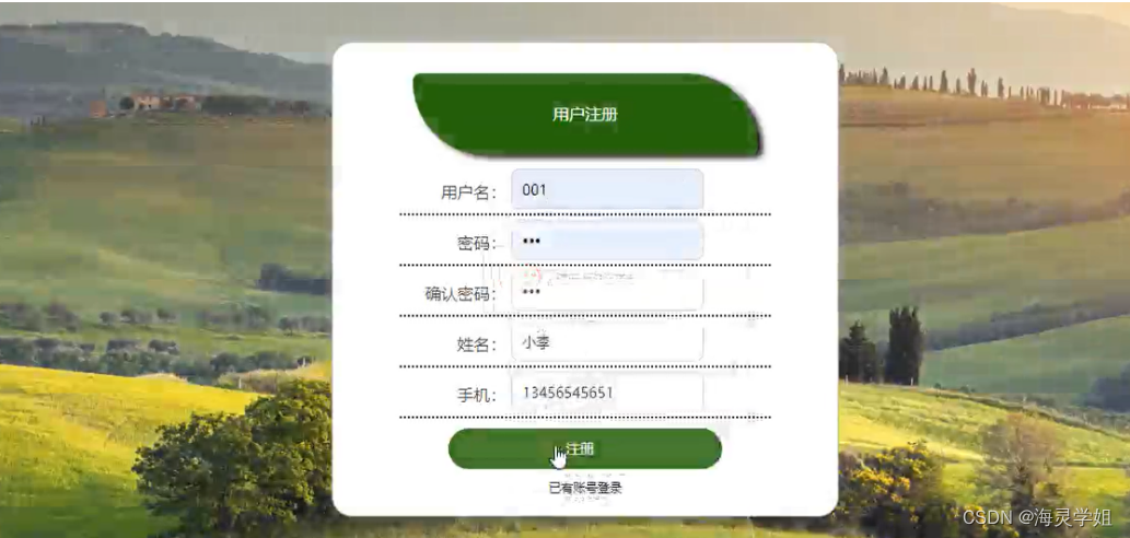 用户注册,在用户注册页面通过填写用户名,密码,确认密码,姓名,手机等信息进行注册操作,如图5-2所示。