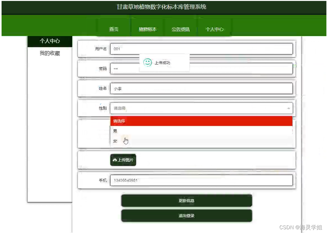 个人中心,在个人中心页面通过填写用户名,密码,姓名,性别,上传图片,手机等内容进行更新信息,还可以根据需要对我的收藏进行相对应操作,如图5-4所示。