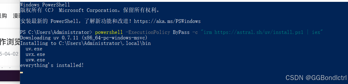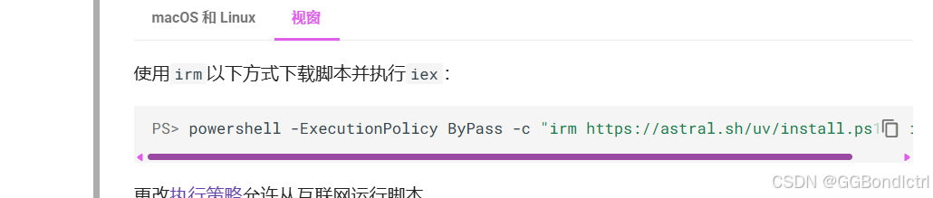 然后安装我们的uv,即复制我们的链接,然后再我们的powershell中运行我们的命令: