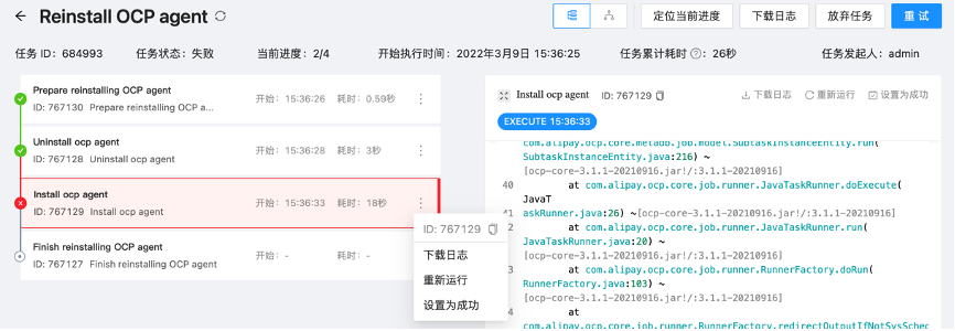 上图展示 OCP 中的运维任务,有两种展示形式,一种列表形式,一种图的形式,都可以非常直观的展示出任务的整体结构,当前执行进度这些信息。