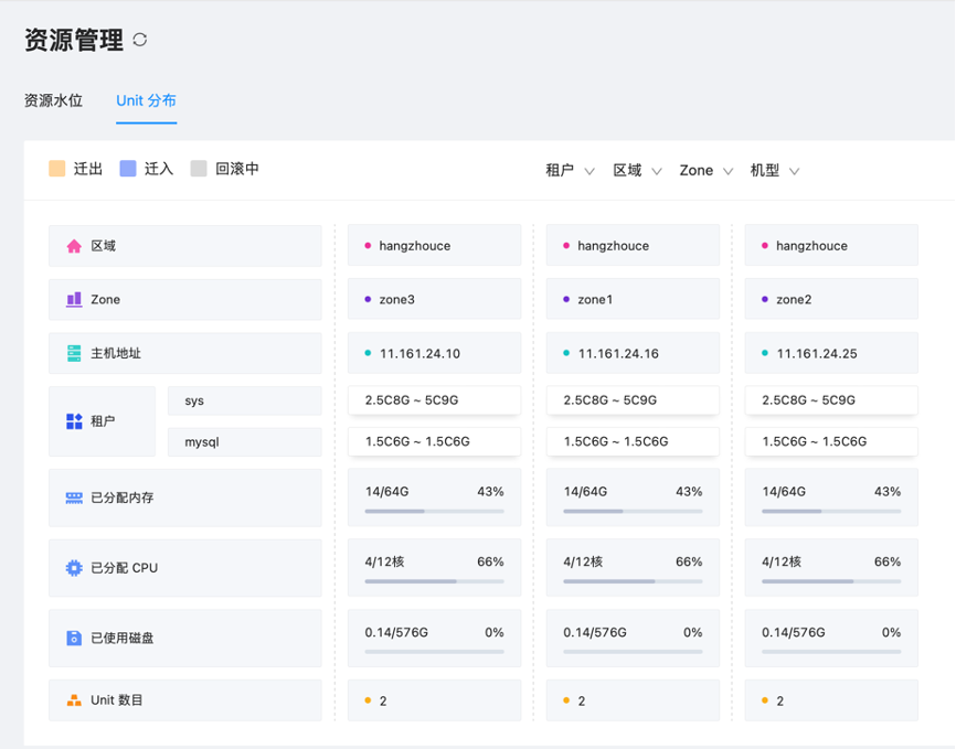 资源分布图会展示出更多更详细的信息,精细到租户的 unit,可以直接在这里发起 unit 的迁移操作。
