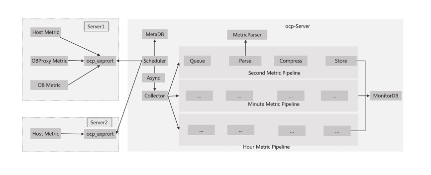 整体的监控链路如上图所示,在主机上都部署 ocp-agent, 其中 ocp_exporter 进程负责 metric 监控指标的采集。根据主机上部署的程序的不同,它会采集不同的监控指标。比如上图的 Server2 上,主机上没有其他服务,就只需要采集主机。而 Server1 部署 OBProxy、OB,就会同时采集这些服务的监控指标。 ocp_exporter 的地址会在运维任务中写入到 ocp
