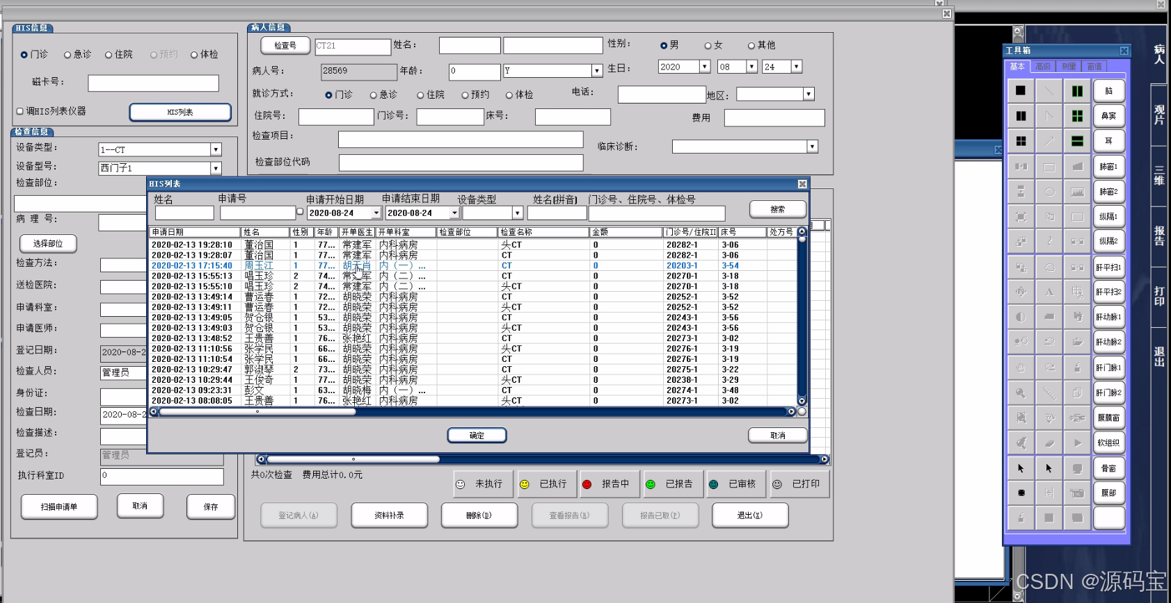 登记:可从其它系统中直接调用预约病人相关信息(也可以手动输入);更完备的病人、检查、临床详细信息的录入机制,以适应各种需求;同一病人多种检查一次登录。