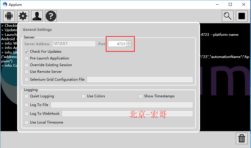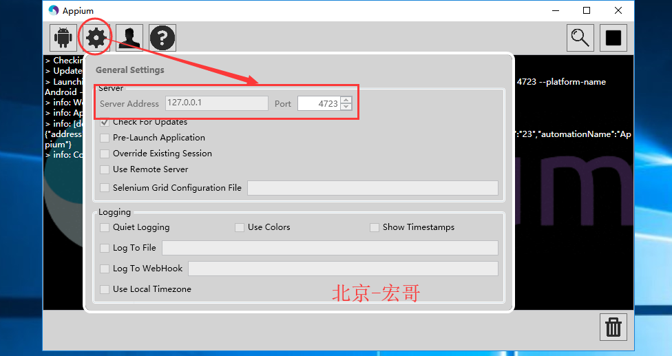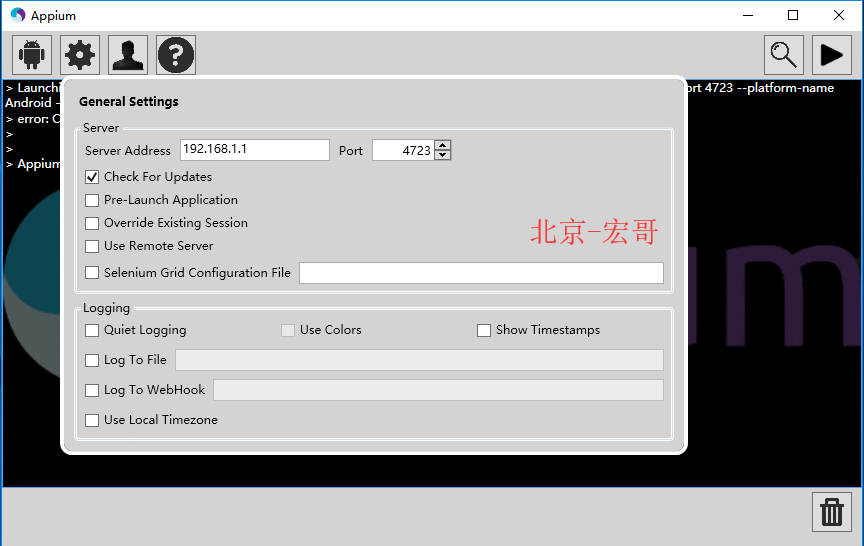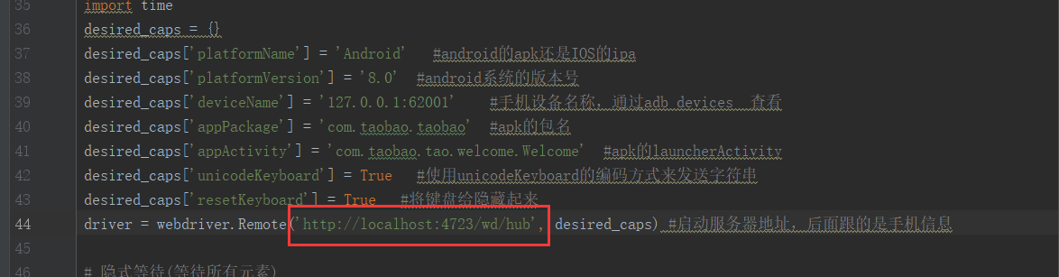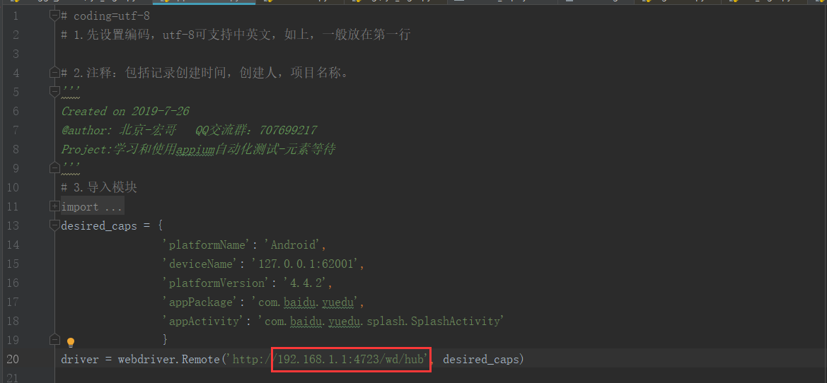 在前边所有涉及启动app的时候有这样一行代码driver = webdriver.Remote('http://127.0.0.1:4723/wd/hub', desired_caps),很多小伙伴们和同学们不知道这个ip和端口哪里来的,我觉得有必要给小伙伴解释一下,于是宏哥决定写一篇关于这个appium的服务器ip文章! 来给大家答答疑,解解惑!这样就不会问一些比较幼稚的问题,让别人看了笑话,笑掉大牙了。eg:宏哥,宏哥,宏哥,那个我在测试服务器搭建测试环境,我是不是就只能在测试服务器上调试代码,然后进行测试了。那这样我还的搭建一套别写脚本的环境。。。。等等的傻白寡的问题,Remote 我们先给他相一相面,就知道它的意思是:远程。那么我们是不是把那个IP地址修改成测试服务器的IP,一切问题是不是就迎刃而解了。