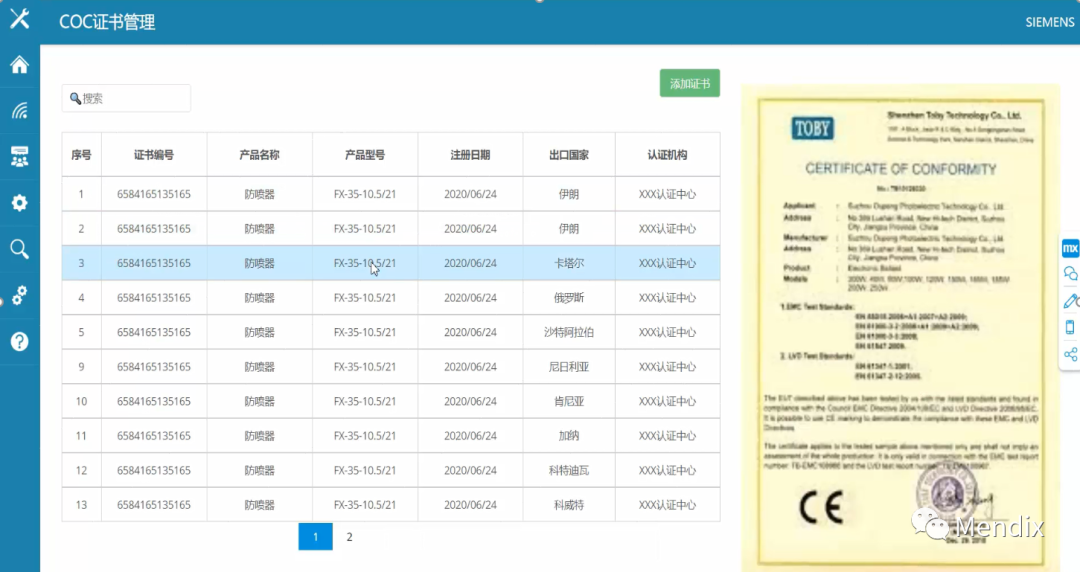 通过Mendix开发的“COC证书管理”,对产品COC证书进行统一管控,与产品建立关联关系,方便在移动端搜索、查看和添加COC证书。同时,能够快捷地查看产品中关重件、外购件的检测记录。所有证书数据将保存在Teamcenter中。
