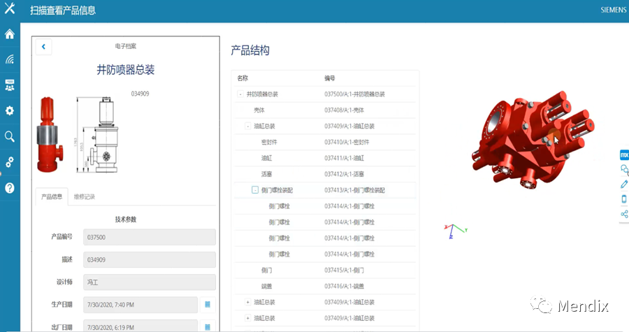 利用Mendix开发的“扫描查看产品信息”,可通过手持扫描设备、手机、PAD等移动端,通过扫描产品RFID、二维码或其它标识码,在线查看产品的相关信息和维修记录等,如产品BOM、模型、技术手册、技术参数等电子档案。所有产品和维修的信息均来自于Teamcenter。