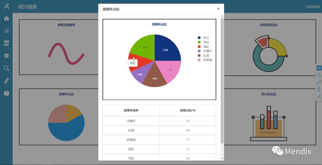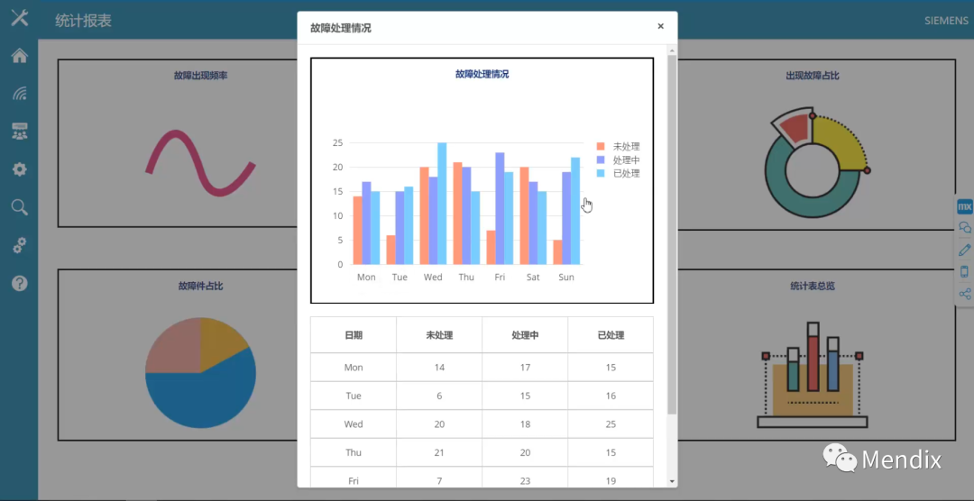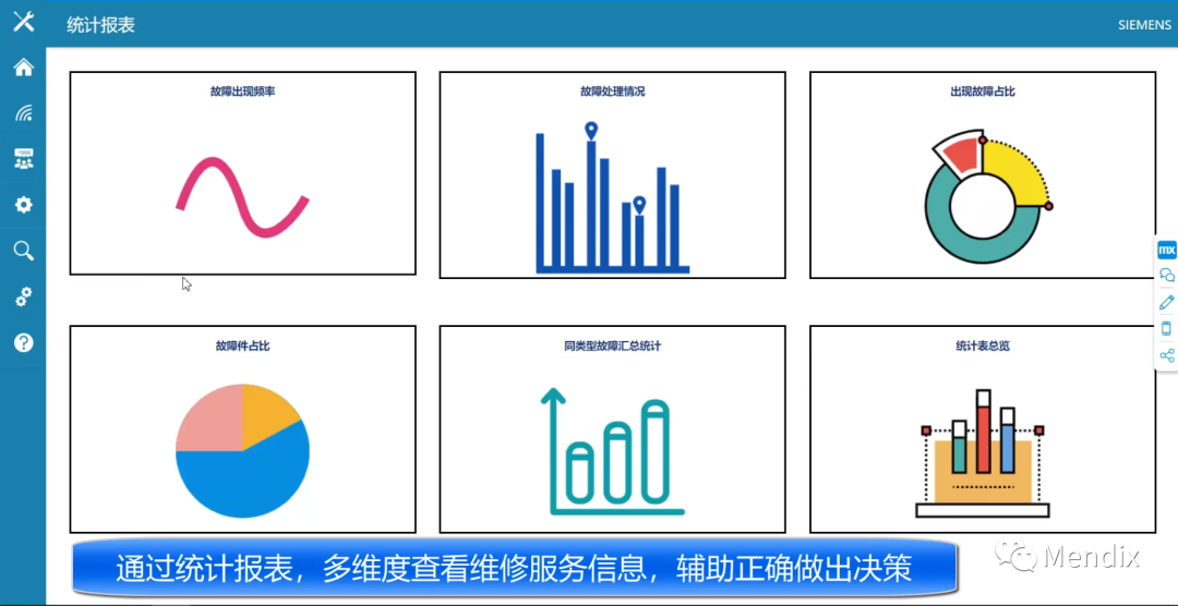 通过Mendix开发的多维度“统计报表”,从Teamcenter中提取相应数据,以图形、报表等形式对维修过程、故障信息、解决措施、服务成本、绩效、产品信息等进行直观的统计分析和展示。提供不同层级、维度、丰富的实时报表,方便进行业务决策和维修KPI指标的考核。