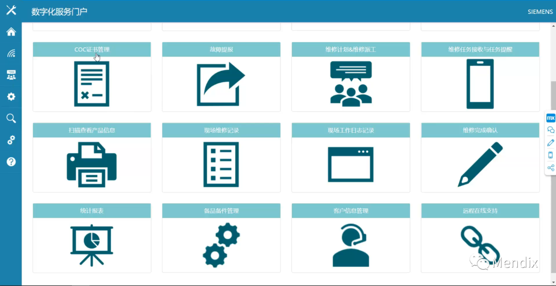 02. 出厂后的厂外管理,部分基于Mendix实现,部分基于Teamcenter实现,部分两者结合共同实现,但大多数都会使用Mendix,如:通过Mendix实现故障提报、维护消息提醒、手持设备扫描查看产品信息、远程在线支持、设备使用记录、现场维修记录、现场工作日志记录、统计报表等;通过Teamcenter+Mendix共同实现维修计划安排&维修派工、维修任务接收与提醒、在线查看检验信息、现场电子作业指导等。