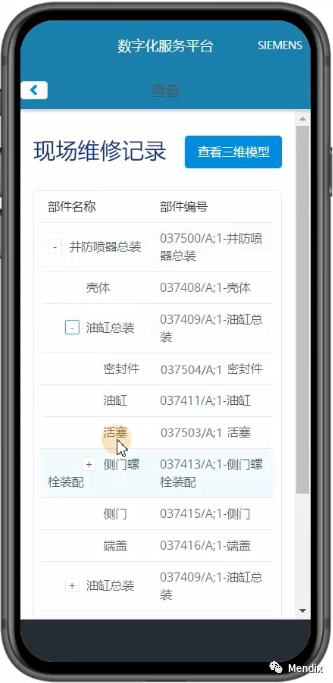 通过Mendix开发的“现场维修记录”,维修人员可在线填写和反馈现场维修情况,如:易损件/维备件的更换、问题零部件的安装/卸载/更换/维修、执行维修服务的时间和位置等信息,对现场维修过程和结果进行在线管理。每次维修后,根据维修人员现场填写的维修记录,能够自动更新Teamcenter中管理的实物维修BOM状态,记录相关的维修服务信息,实时保持最新状态,作为下一次维修的依据。维修记录上传后,可通过手机、PAD等移动端在线查看更新后的实物维修BOM。这里Mendix开发的“现场维修记录”将与Teamcenter保持关联和同步。