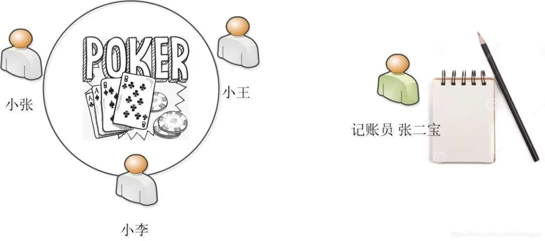 原来的模式下:所有的记账都是一个集中式的,由张二宝同学集中记账,所有的记录以中央记录的账本为准,每一个参与者(打牌的人)要想了解记账信息,就要向集中的账本查询。在异常的情况下会出现账本丢失损毁,所有信息就会丢失;还会出现集中记账系统出现错误时候(漏记,记错,或者有意篡改数据的可能)。