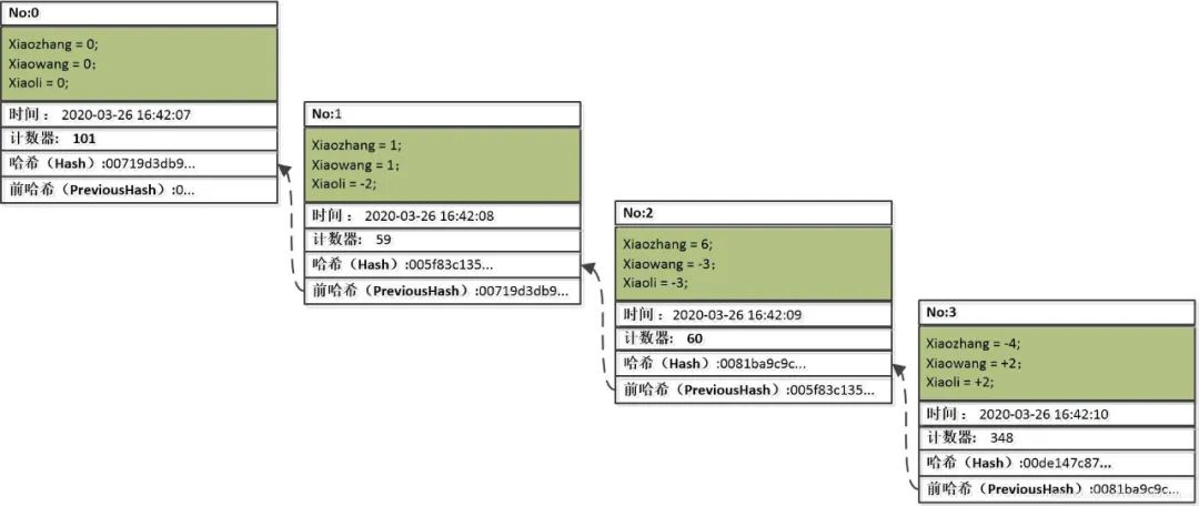 每个区块通过记录前面一个区块中的哈希值,把整个区块链接起来,形成了“区块链”。