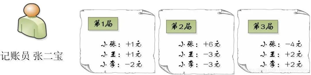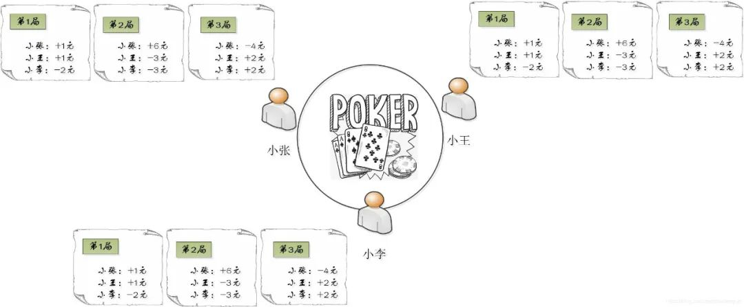 接下来是具体的输赢数据,第一局,小张赢了1元,小李赢了1元,小李输了2元,依次记录;