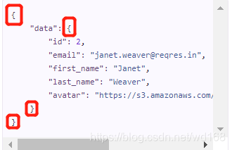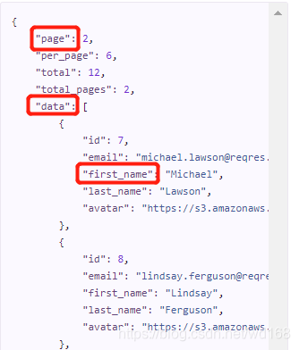 上图第一个红框”page”是一个 JSON 对象,我们可以根据键”page”来找到对应的值是 2,而第二个红框“data”是一个 JSON 数组,并不是一个 JSON 对象,不能直接去拿到里面的值,需要遍历数组;第三个红框”first_name”是在一个嵌套 JSON 字符串中,可以根据里层 JSON 对象的” first_name”来找到对应的值”Michael”。