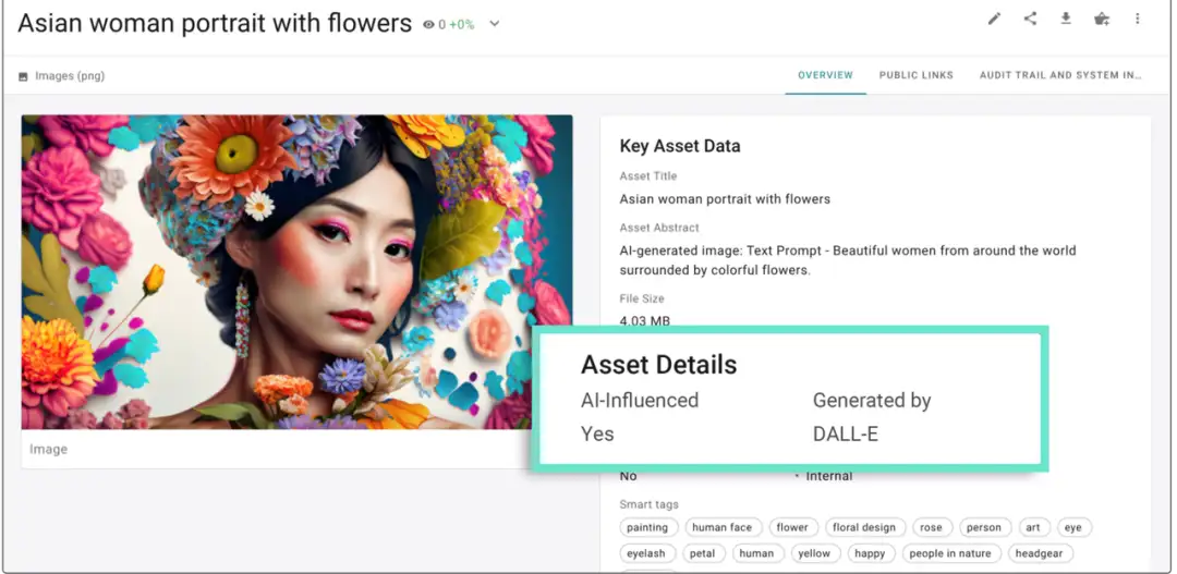 海外欧美的DAM供应商及系统工具,新增迭代了“智能识别哪些创意内容是Gen.AI工具生产的”新功能:历史创意素材被上传保存在DAM时,系统会自动鉴别哪些素材是AI生产的,同时鉴别出该创意素材是由哪个AI工具生产的,从而帮助品牌和设计师们更好地判断 AI vs. 非AI 产出的创意;在使用、复用这些创意素材时,确保内容的安全、合规。