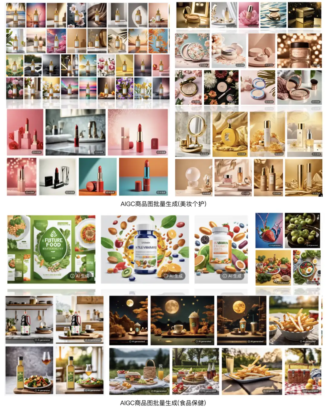 2. 商品图批量生产提效:最新落地实践的AIGC技术,已经可以在商品图生产上提效百倍以上。设计师们只需要提供商品白底图,输入场景描述的提示词,AI技术能够以指数级的速度产出场景生动的商品图。但有设计师问:“怎么确保AI生产的图片和期待的效果是一致的?”“如果没法掌握提示词,导出AI生产的图片不符合预期怎么办?”品牌内容设计师们如果觉得自己使用AIGC工具有学习成本、0-1去生成图片导致交付周期长,也可以先尝试做“商品图AIGC专属模型训练”:有技术落地和实践经验的供应商可以基于设计师提出的的风格需求和期待的成片风格类型,配置品牌专属的“AIGC商品图灵感画廊”,大致链路是:品牌提供商品白底图→在AIGC商品图场景模版里选择背景图场景→系统(约在24小时内)批量生成上千张商品图→设计师挑选适合优化的商品图。这种将AIGC工具+模型训练服务相结合的落地实践,在电商、社媒投放场景被实践的最多。